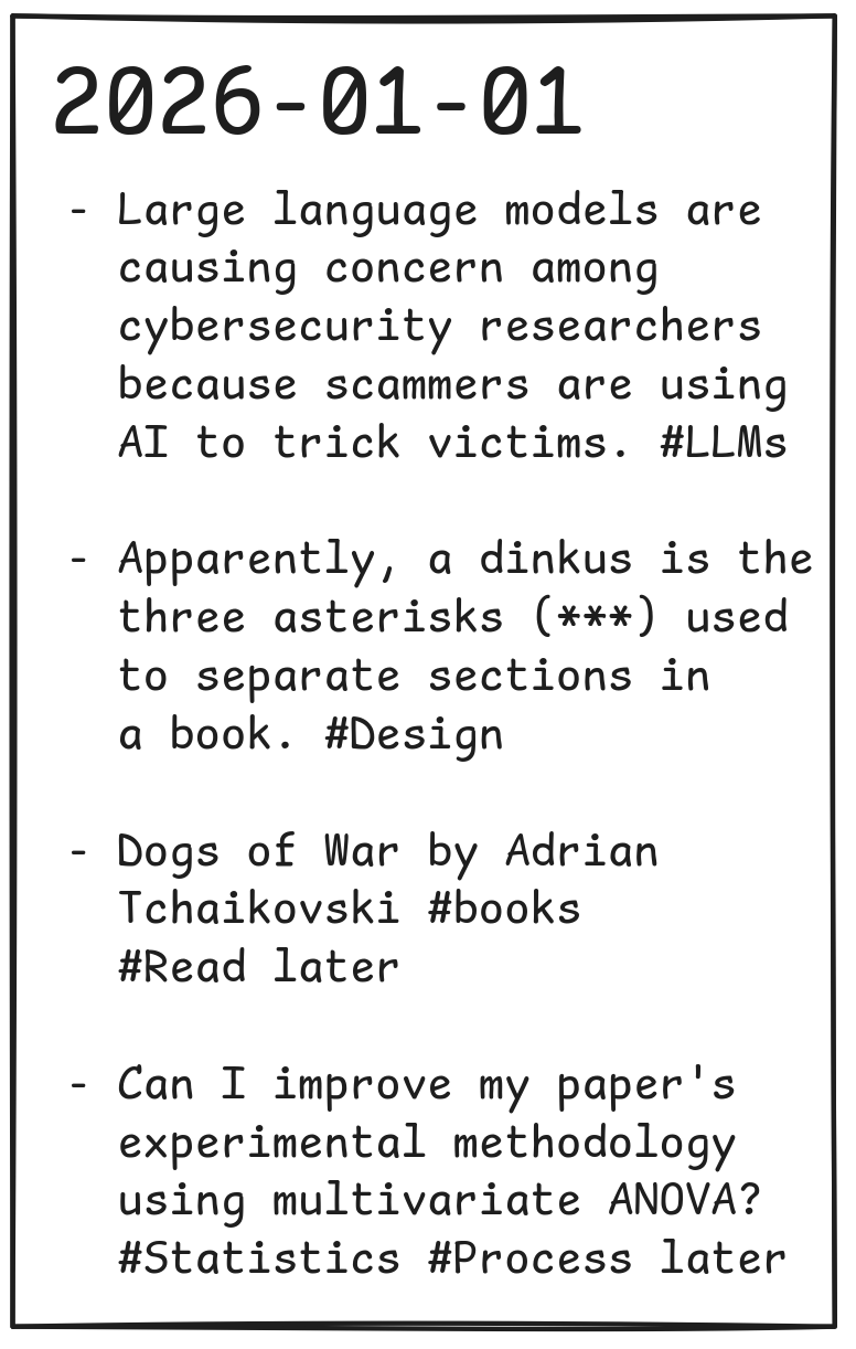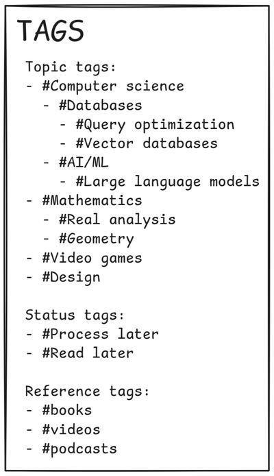- Hobbies: Don't confine the topic of your note-taking to "serious" topics. I have tags such as #Overwatch and #Deadlock (my main video games these days) as well as tags like #showerthought, #birds, and #journal. Topics should cover all topics that interest you, and you'd like to take some notes on.